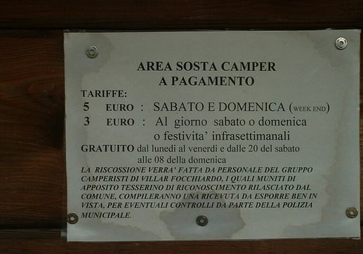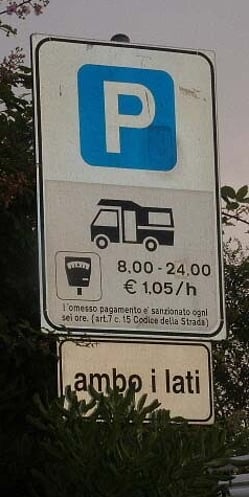 Some Sostas are free, and others are free on certain nights but are charged for on other nights. Look for the sign (like the one in the picture on the left) explaining all this at the site. This Sosta is €5 for the weekend or €3 for a single night at the weekend. It’s free from Monday to Friday and is also free if you turn up after 8.00 pm Saturday and leave before 8.00 am Sunday. Some Aree di Sostas have an “honesty box” system in which you leave your payment, but more commonly there’ll be a ticket machine. During the day it will dispense tickets for parking by the hour, and after a certain time, it changes the hourly rate so you can stay all night at a reduced tariff.